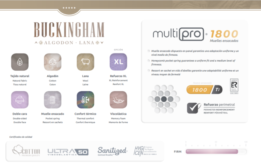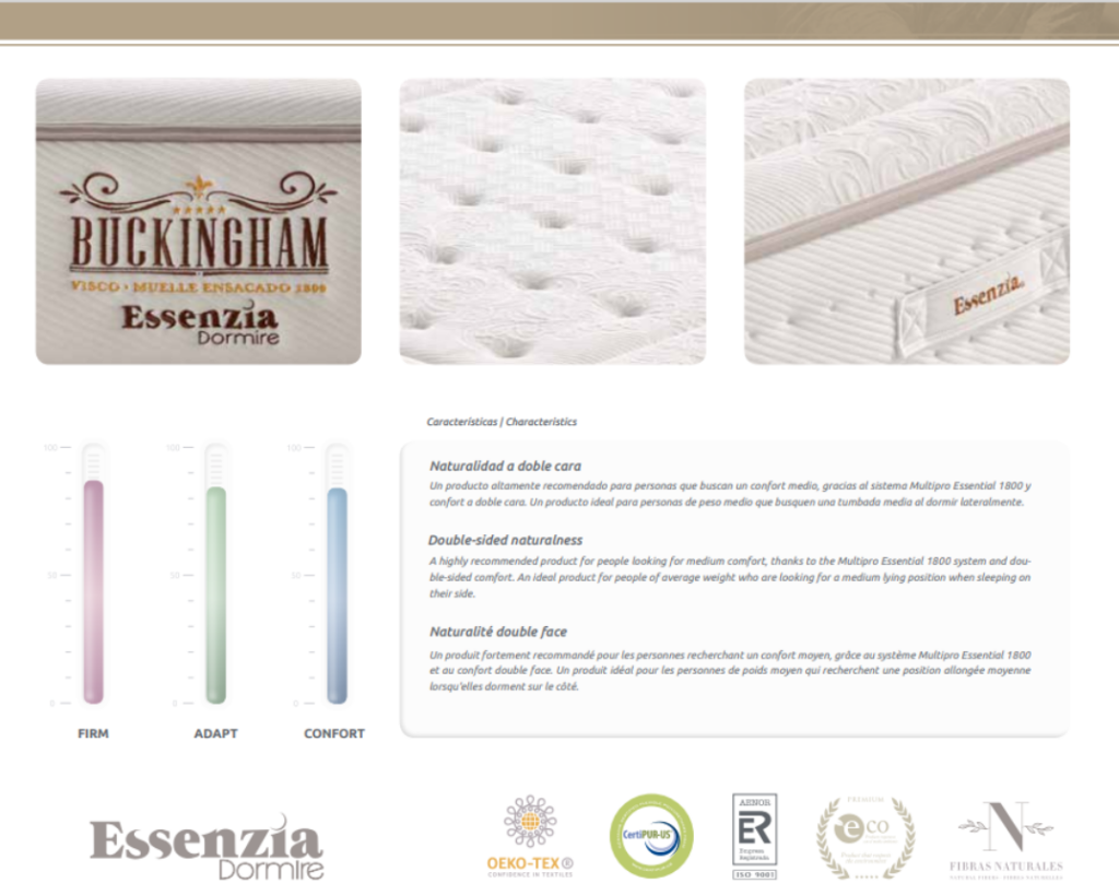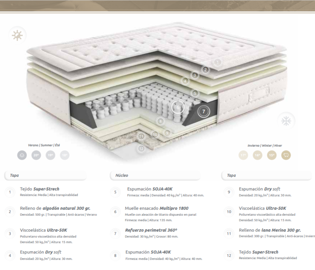 Un producto altamente recomendado para personas que buscan un confort medio, gracias al sistema Multipro Essential 1800 y confort a doble cara. Un producto ideal para personas de peso medio que busquen una tumbada media al dormir lateralmente. Tejido Tencell Natural, acolchado en Algodón Natural 500 gr/m2, VERANO y Lana Merino 300 gr/m2, INVIERNO. Viscoelástica de Soja Natural. 1800 MUELLES ENSACADOS DE TITANIO.