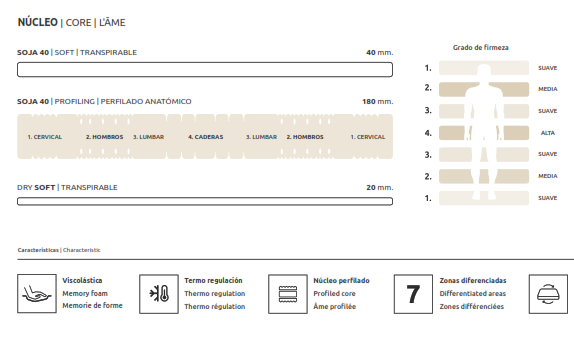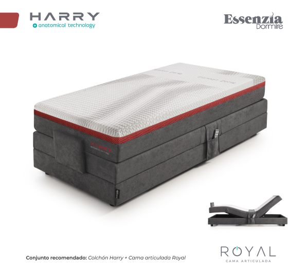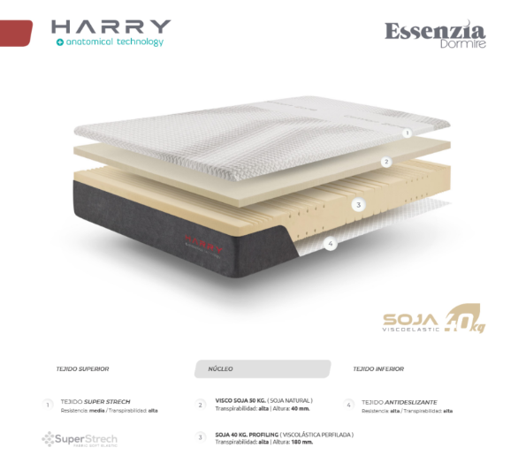 El colchón Harry de Essenzia es un colchón de firmeza media-alta, con núcleo Soja 40 Kg de espumación con perfilado anatómico, y Visco Soja Natural 50, una viscoelástica de alta densidad y Soja 50 kg, muy transpirable. Es ideal para cama articulada. La funda es de Strech Comfort Zone.